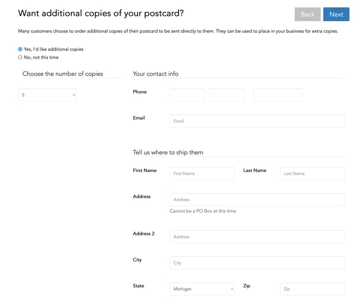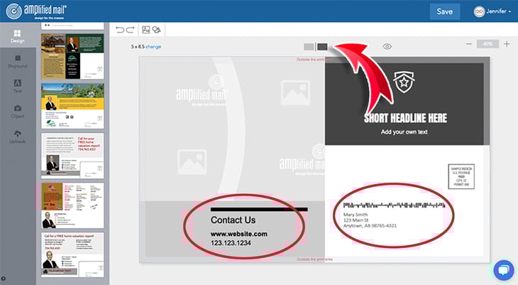 10. When you are ready to design your mailer back, click the gray box at the top. Don’t forget to include your important contact information like your phone number and business address.