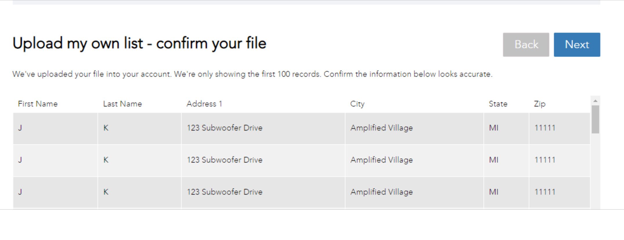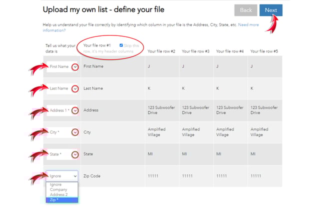 15. Use our data mapping tool to help us identify the right columns and match your data to the required fields (first name, last name, address 1, city, state, zip). If you have a header row in your uploaded list, click the “Skip this row” box. Once your list has been mapped, click “Next.”