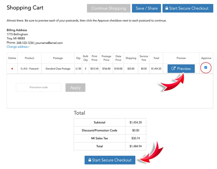 19. Click “Preview.” Use the left arrow to see the front and the right arrow to see the back of the postcard. If you are ready to proceed, click the “X” to close the preview box. Then, click the “Approve” box beside the postcard you wish to order. If you have a “Promotion code,” add it now and select “Apply.” Now you are ready to “Start Secure Checkout.”