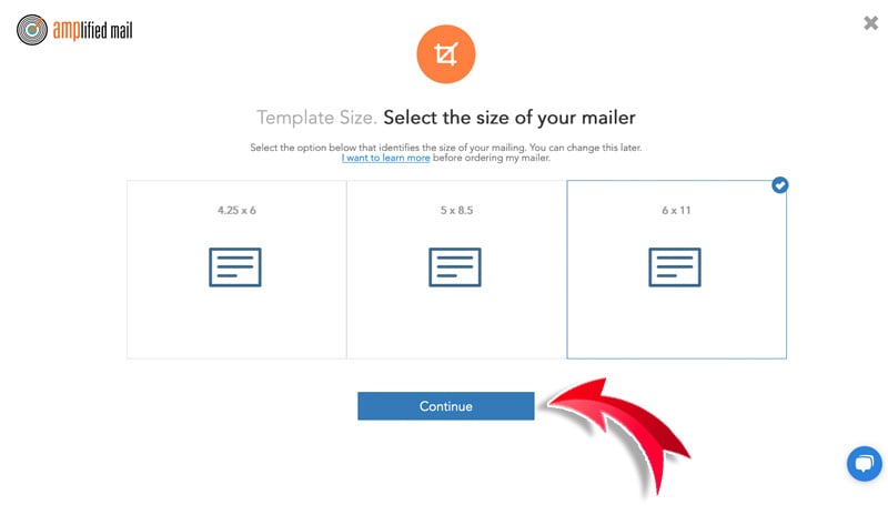 6. Select one of the three pre-approved postcard sizes. Click “Continue.”