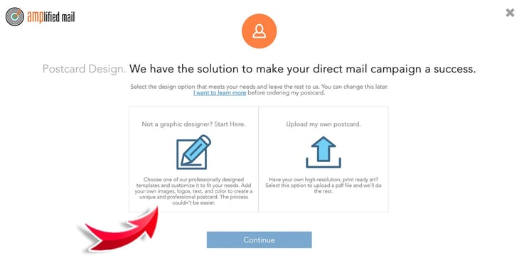 7. Next, start designing your postcard. Select “Not a graphic designer? Start Here” to get the process rolling. Choose from one of our templates to modify, or start from scratch.